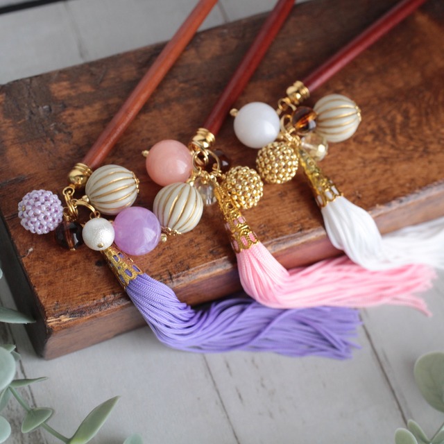 ボリュームのあるタッセルが印象的なかんざし。 自作のビーズボールやアクリルビーズ、ガラスビーズなど5種類の大きめビーズをバランスよく配置しました。 飾りの長さは軸の長さとほぼ同じ15cmほどあります。 パッと目をひくゴージャスなかんざしです。 卒業式、成人式、花火大会やお祭りにも。 和装によく映えるかんざしですが シンプルな洋服に合わせてもかっこいいですよ。 丸カン不使用 総重量16g