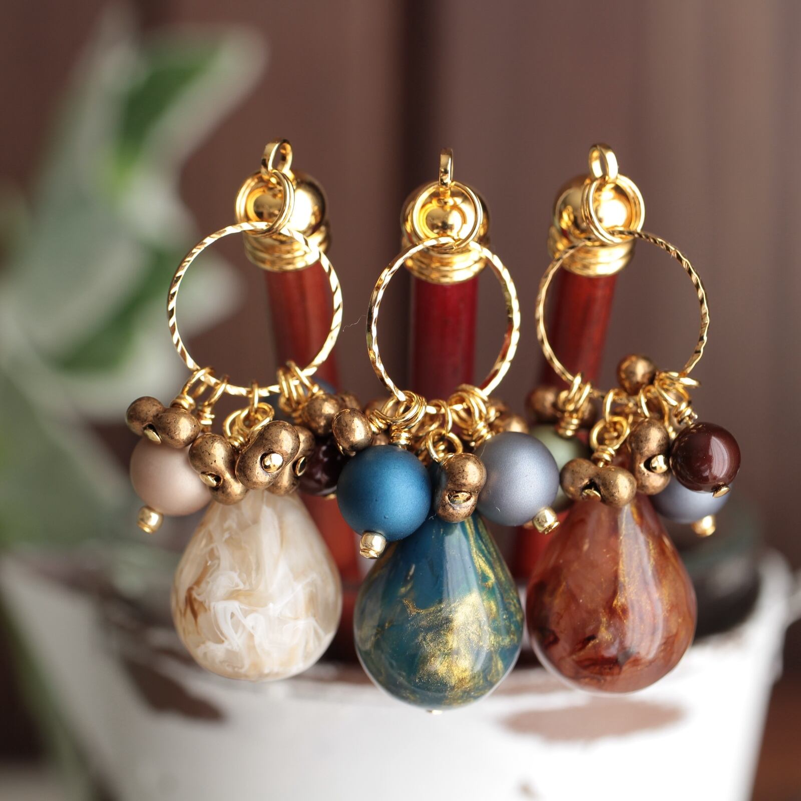 ぽってりとした大きなしずく型のアクリルビーズ、くすみカラーのパール、つやつやのパールをブロンズカラーのチェコビーズが繋ぎます。
