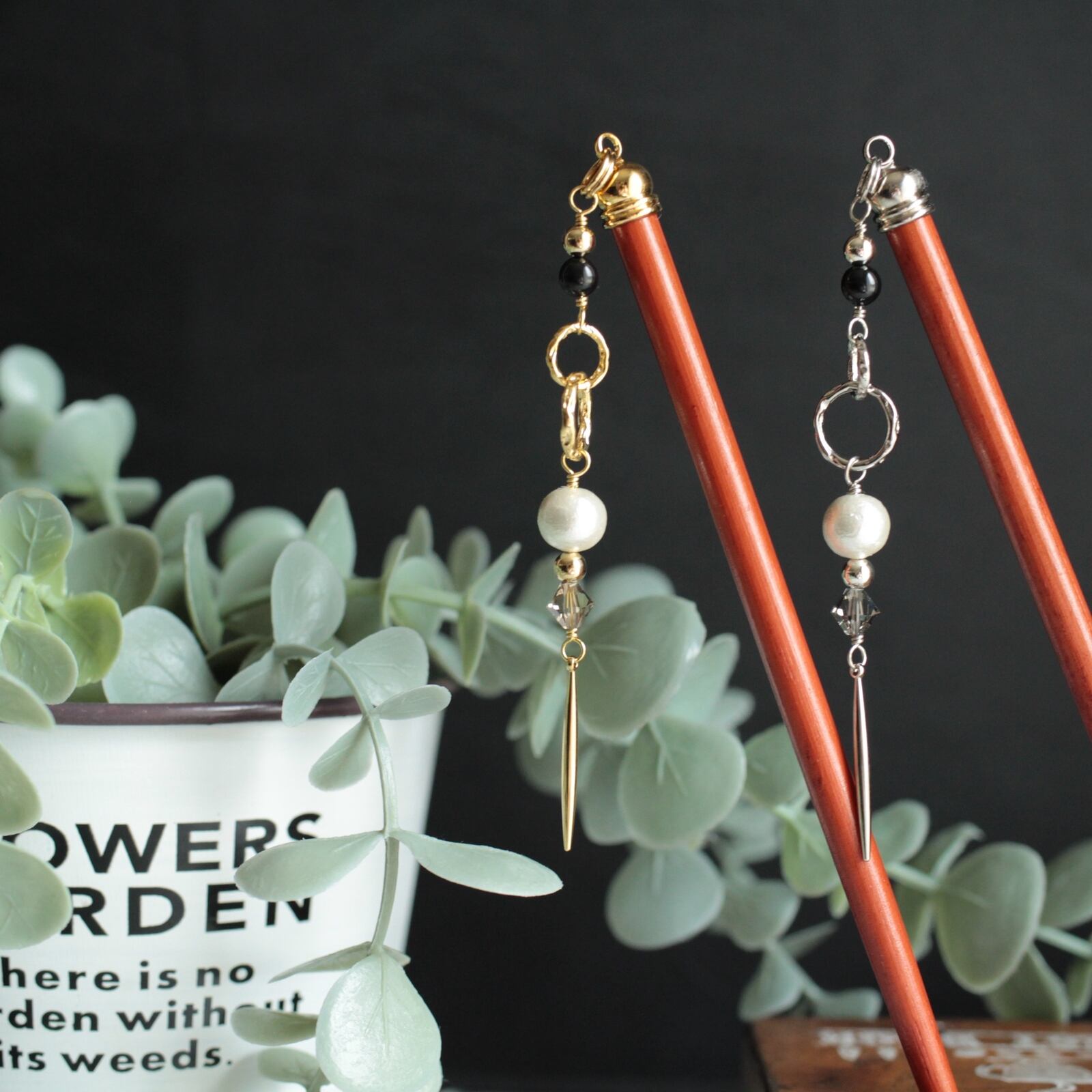 このかんざしはゴールドカラーの中に黒がアクセントにはいる、上品なデザインのかんざしです。