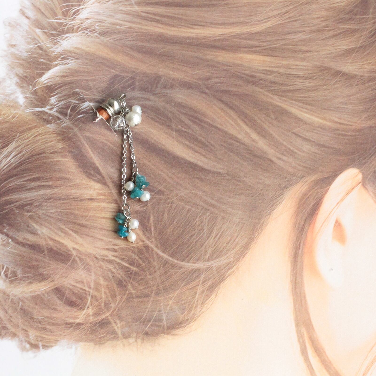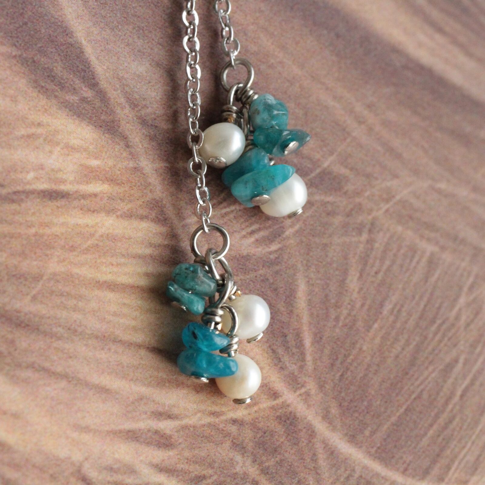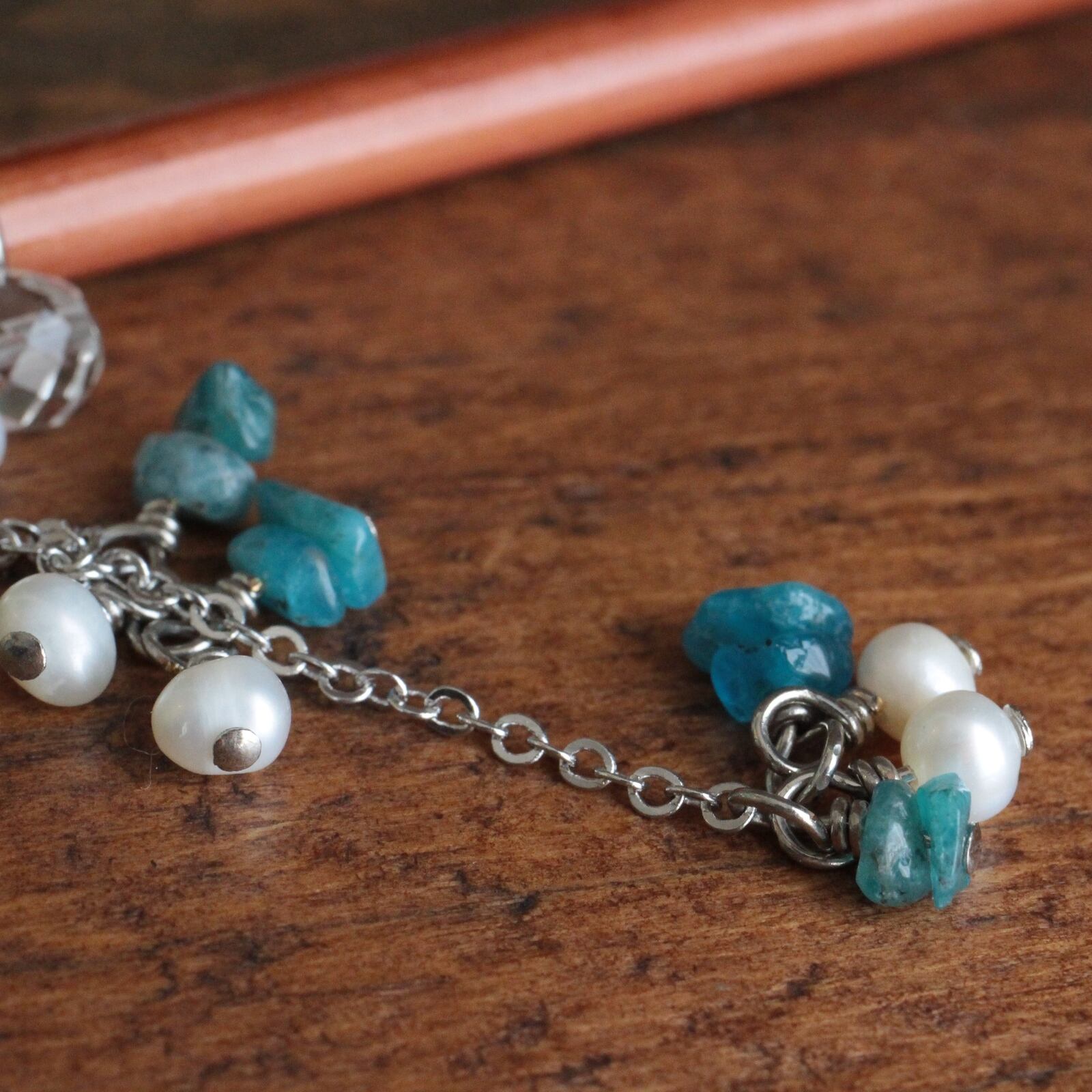 天然石のさざれと淡水パール、チェーンの組み合わせはとても繊細でエレガント。
