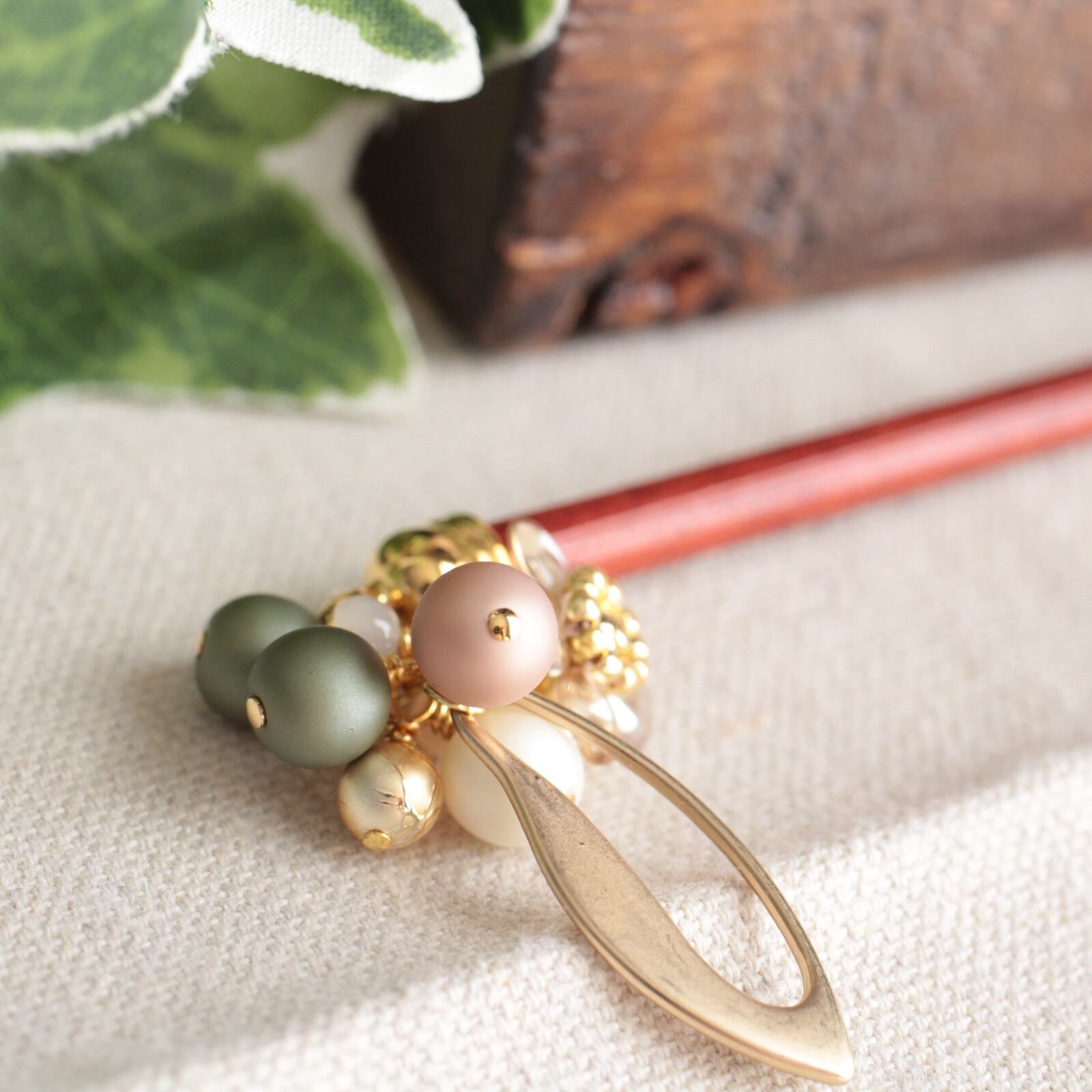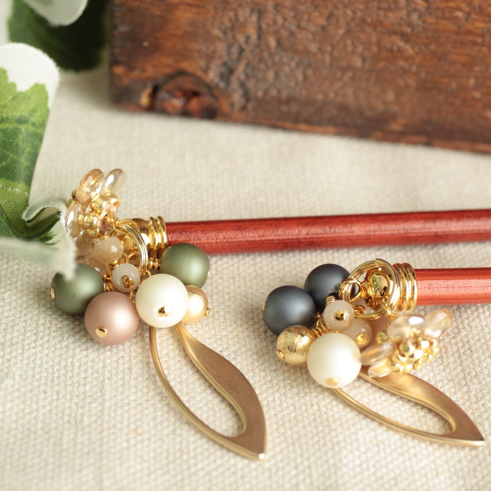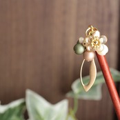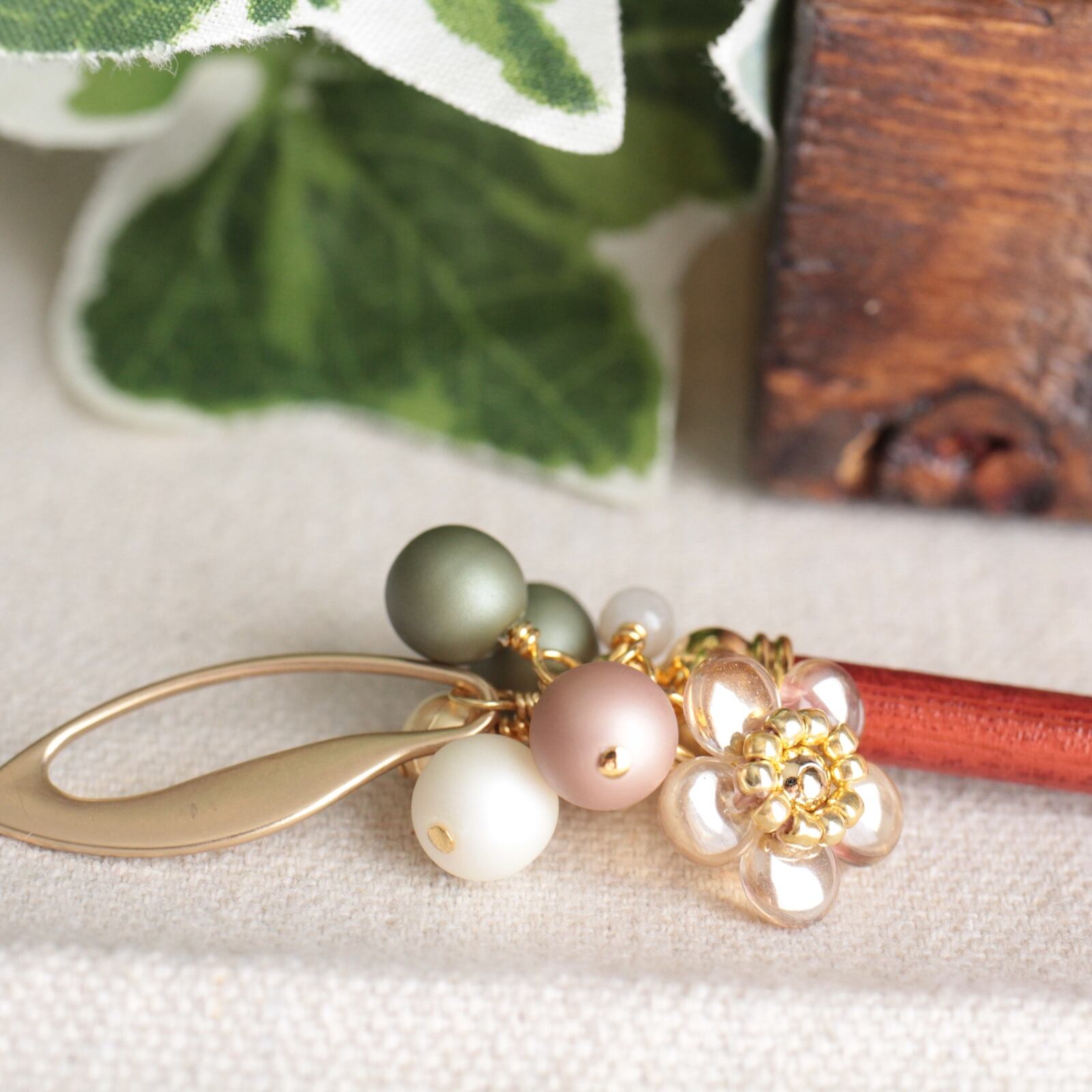 つや消しのパールとマットゴールドのリーフチャームが全体を上品にまとめています。